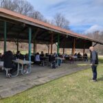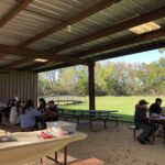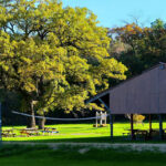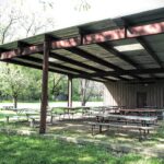 Nestled in the center of our campground, the pavilion has connected bathrooms and seating at picnic tables for around 60 people. A water pump and open field are located next to the pavilion.